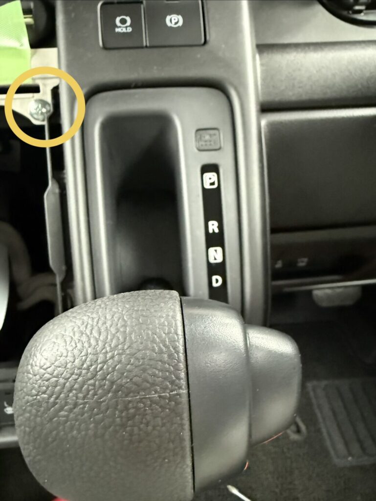 ナビ周りのパネルがとまってる黄丸のネジを2箇所取り外し、パネルを引っ張って取り外す。